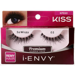 KISS i-ENVY Premium So Wispy 03 Lashes (KPE60) features 100% REMY Human Hair with highly textured natural wispy style look for volumious lashes throughout. These wipsies lashes are subtly curled to blend perfectly with your own lashes regardless of eye shape. These delicate lashes transform your eyes to be wink ready with its eye winged to perfection flutter effect.